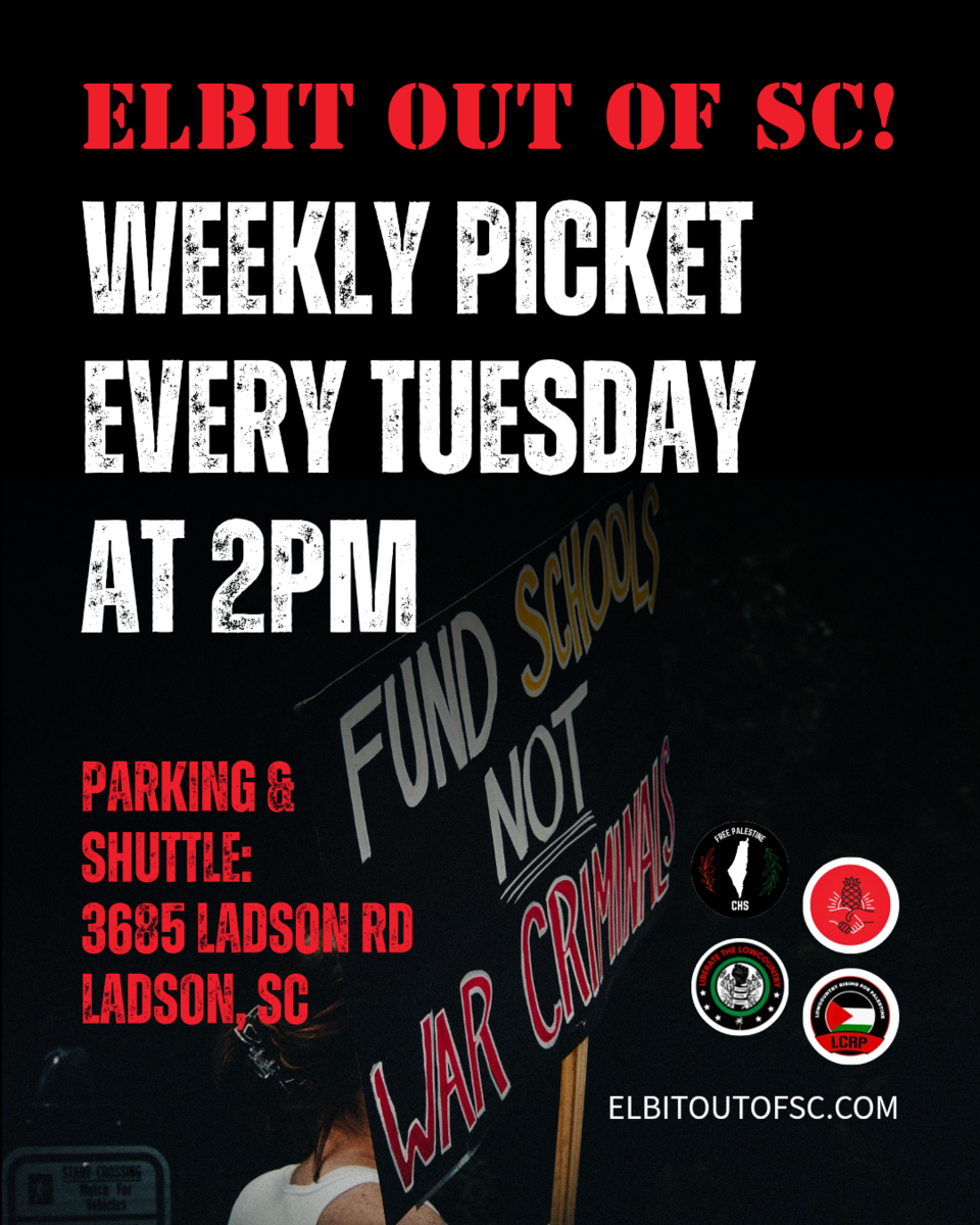 Our weekly pickets have been the most effective way to put direct pressure on Elbit in Ladson, at times pushing the company to close doors early and driving up their cost for participating in genocide. We will be picketing every single week until we get #ElbitoutofSC.